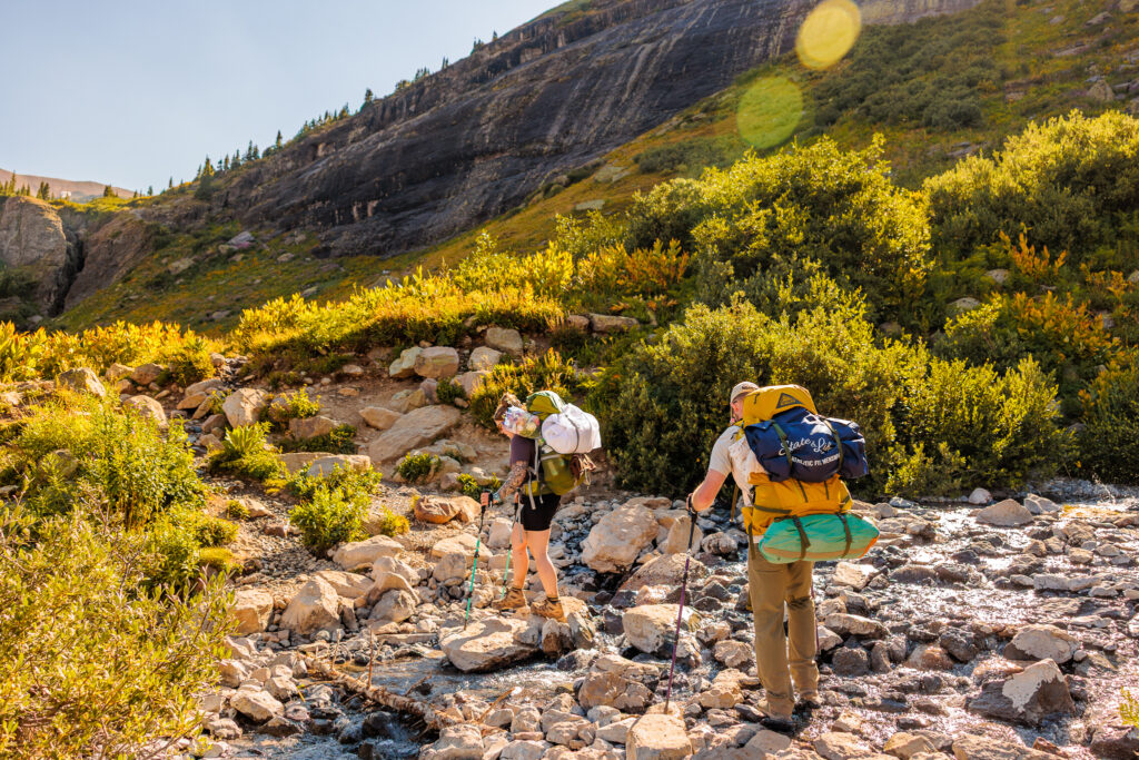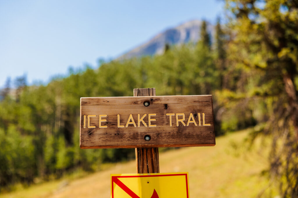 We started Morgan and Anthony’s adventure elopement, getting ready, at the trailhead, to hike to Ice Lake Basin. They packed up their backpacks. Morgan attached her wedding dress and bouquet to her pack, and they were ready to hit the trail! Before we officially started hiking, we all logged in to the overnight registry. Morgan and Anthony made a little note that they were getting married! The trail was stunning in mid-August, with fireweed flowers popping everywhere. It was simply beautiful. The trek up was a challenge, but we eventually made it to Ice Lake Basin. It was quite a celebration when we saw the incredible “Gatorade blue” water and jagged peaks of Ice Lake!
