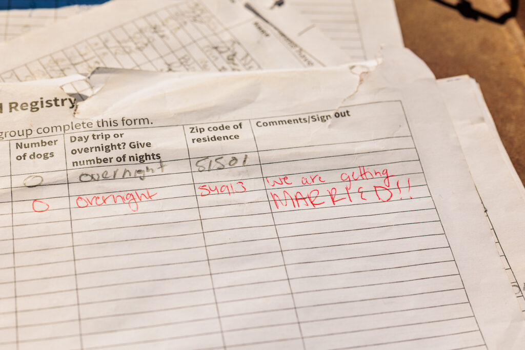 Soon enough, it was time to head back to Ice Lake and get ready to make our way to the trailhead. Before taking down our tents, they signed their marriage license to make it official! They changed into hiking clothes, and Morgan wore an adorable t-shirt that said “Bride” on the back.