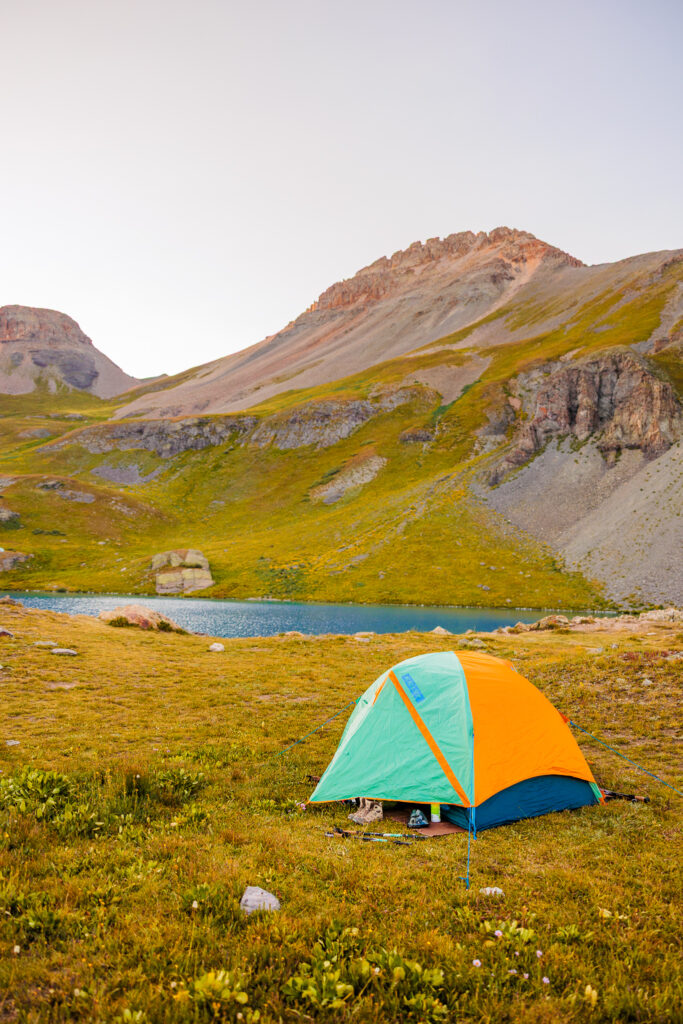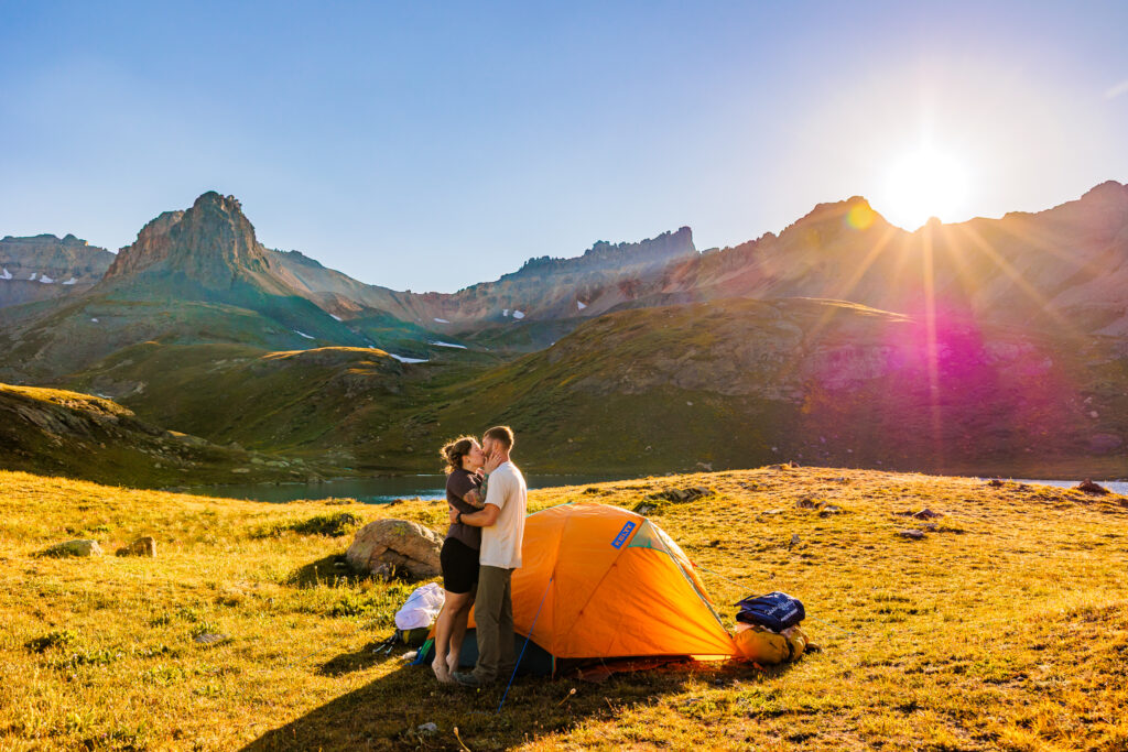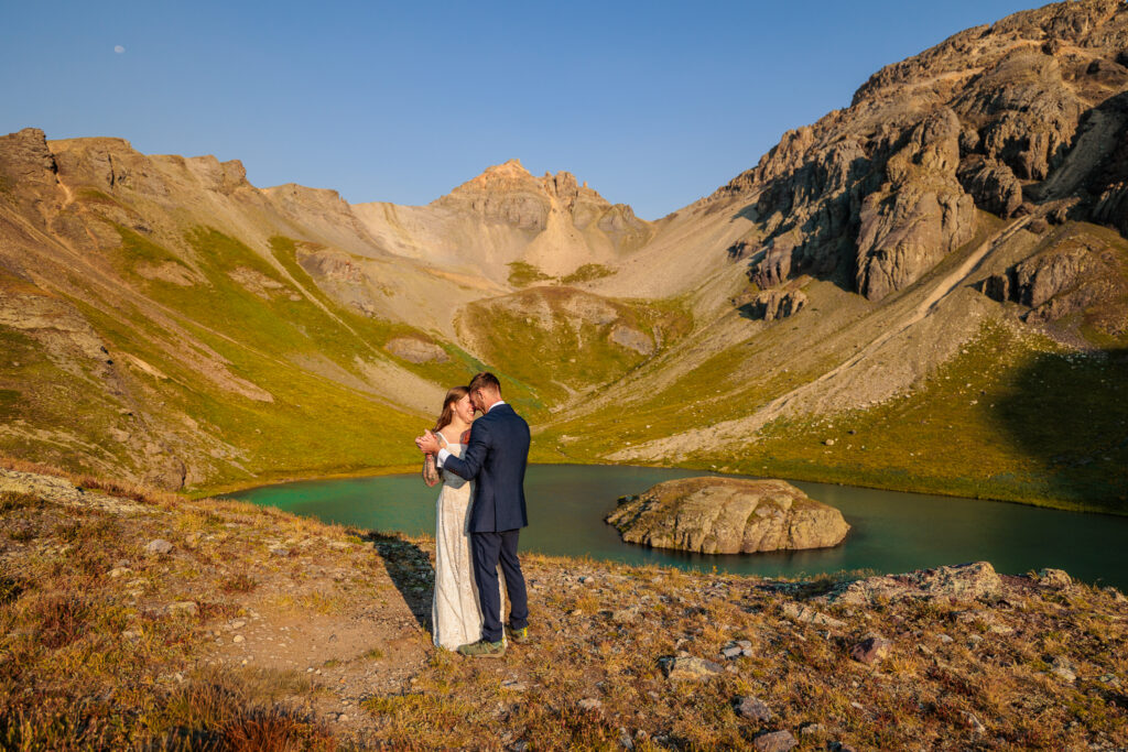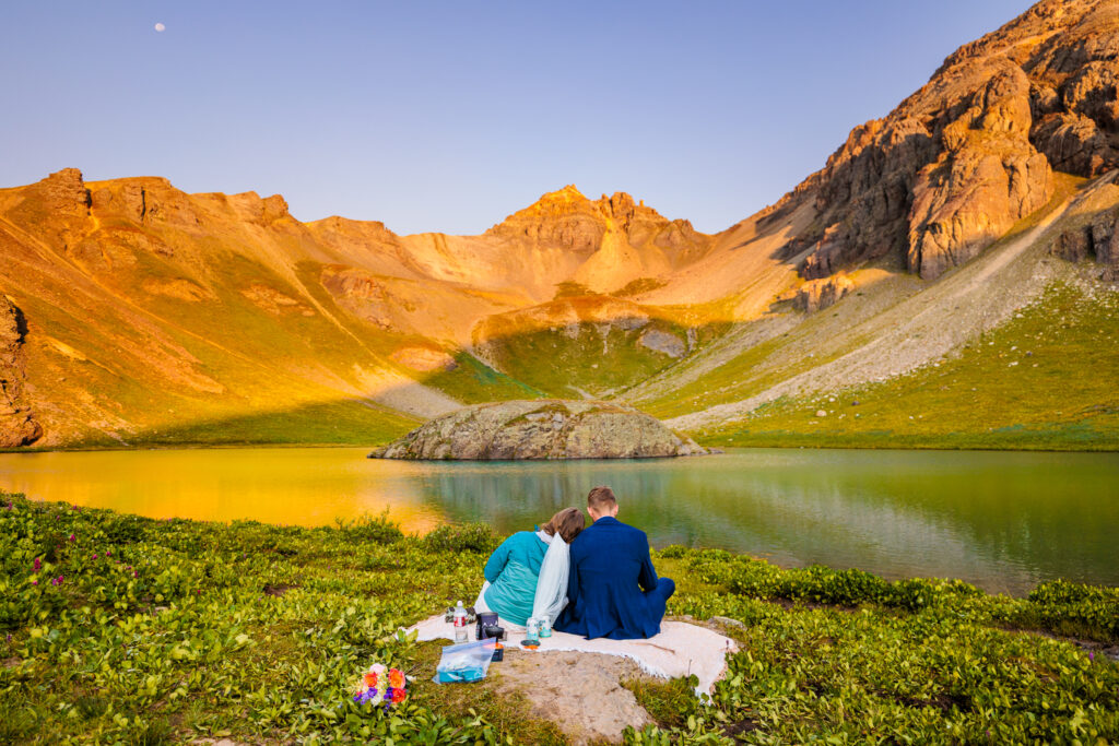 Ice Lake and Island Lake, located at 37°48’49.8″N 107°48’32.6″W, is not a destination for everyone eloping in Colorado. But, if you are willing to put in some work to get to your ceremony site, the incredibly blue water makes the effort 100% worth it! The hike to Ice Lake and Island Lake is a total of about 8 miles roundtrip if you choose to make it to both lakes, which you absolutely should. This hike is possible to do as a day hike on your elopement. So, you don’t necessarily have to backpack if you don’t want to. Morgan and Anthony knew they wanted a sunrise ceremony. Therefore, they wanted to be close to Island Lake at the start of their day and chose to have a two-day adventure, camping at Ice Lake the night before!
