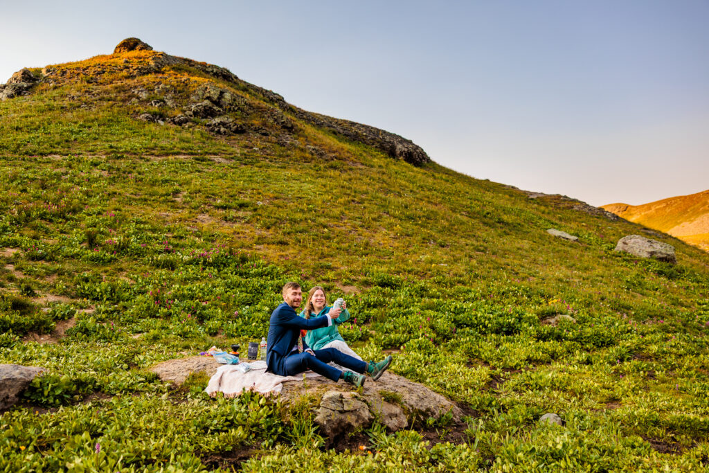 As the sun continued to rise and illuminate the peaks towering over Island Lake, Morgan and Anthony read their vows to one another. It could not have been a more stunning ceremony. The green color of the lake, the glowing mountains, and the colorful wildflowers surrounding them were all so gorgeous! After exchanging rings and sharing their first kiss as a married couple, it was time to enjoy a little picnic. Morgan and Anthony brought their backpacking stove so that they could have breakfast and some trail beers to celebrate! After breakfast, as the sun continued to get higher and completely light up the alpine tundra, Morgan and Anthony had their first dance. Just because they eloped at an alpine lake miles away from town, didn’t mean they were going to let that stop them from having their wedding day traditions!